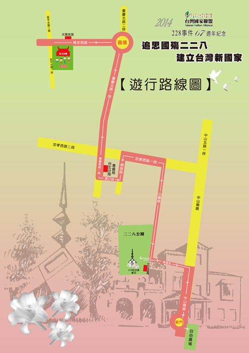 遊行路線:會場→228紀念碑獻花→自由廣場